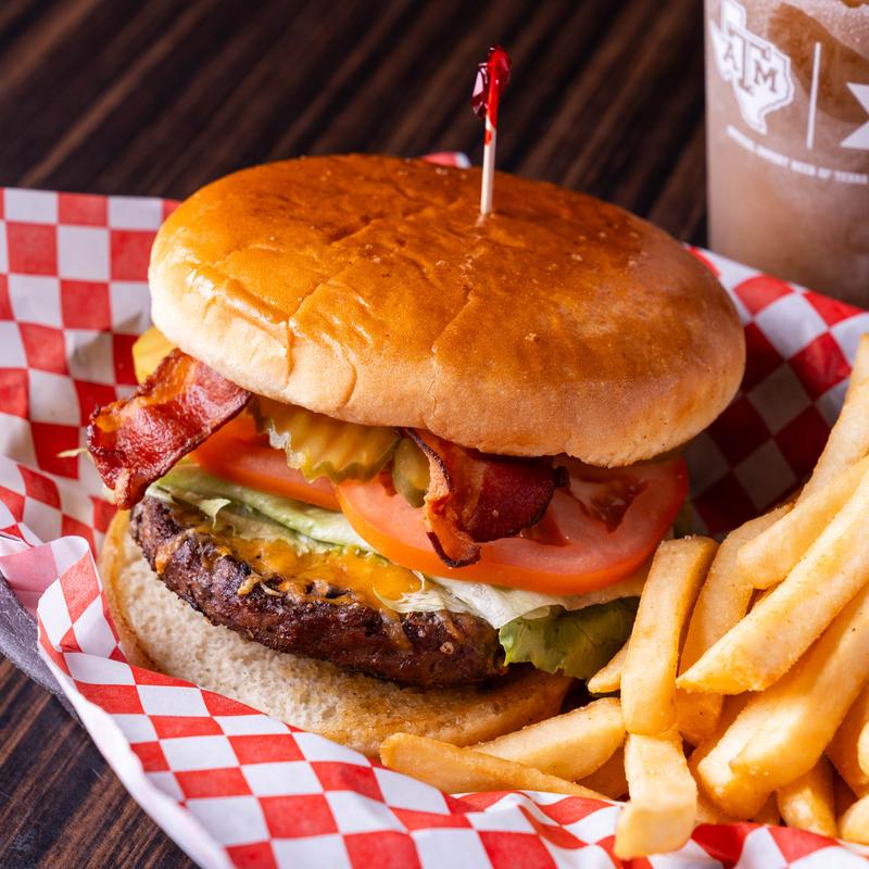 8oz Certified Angus beef patty grilled to perfection. Topped with crispy lettuce, fresh tomatoes, Texas sweet onions, tangy dill pickle slices, and American cheese, on a freshly toasted bun. Served with crispy French fries.
