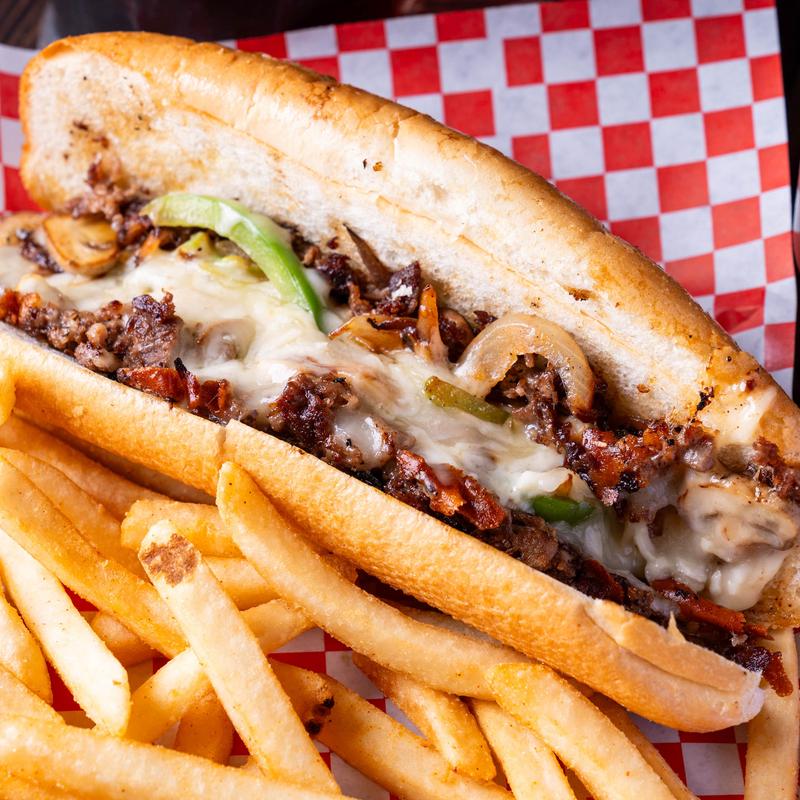 Topped with sauteed mushrooms, bell peppers, grilled onions, and melted mozzarella cheese. Served with French fries.