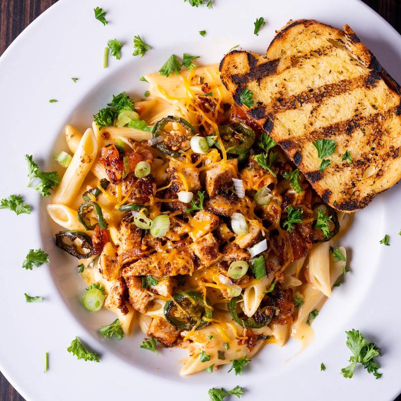 Our signature spicy cheese sauce blend poured over fresh penne pasta, topped with 8oz of zesty blackened chicken breast. Served with crunchy garlic toast.