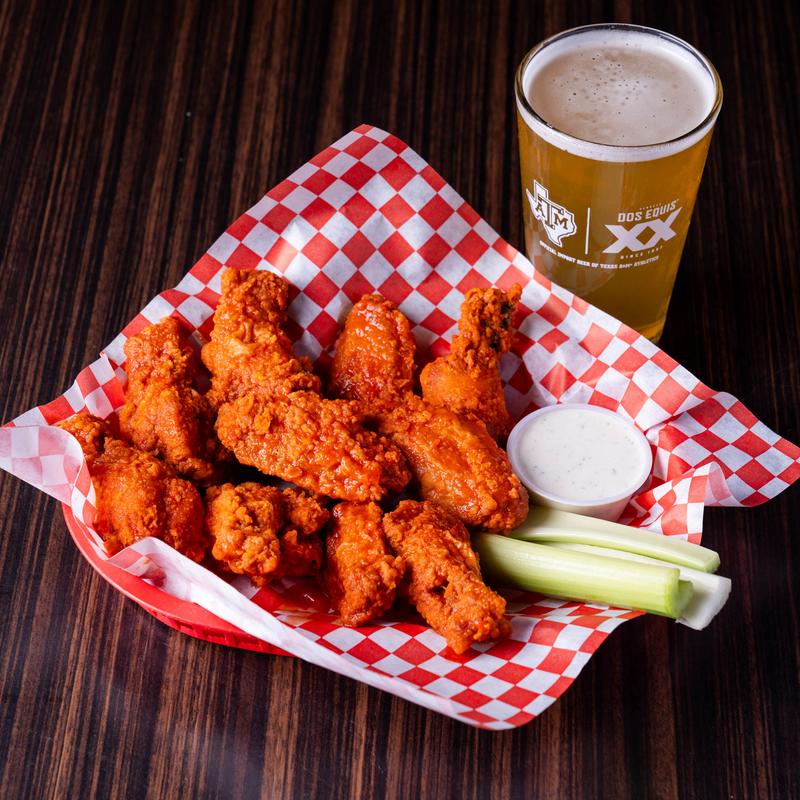 Your choice of 10 open-flamed grilled or fried chicken wings, served with a side of our homemade ranch dressing. Tossed in your choice of one of these sauces: