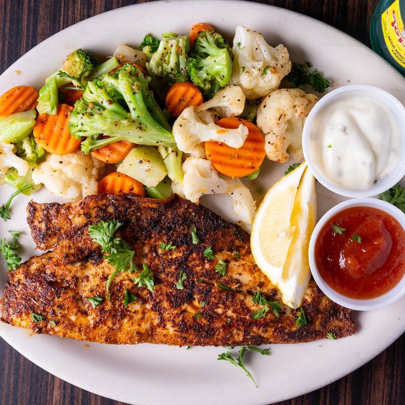 8oz All-natural chicken breast grilled or blackened. Served with creamy redskin mashed potatoes, fresh sauteed mixed vegetables and a crunchy slice of garlic toast.