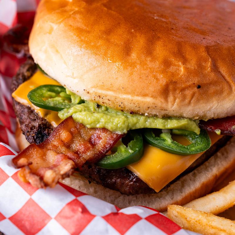 8oz Certified Angus beef patty grilled to perfection. Topped with cheddar cheese, fresh jalapeno peppers, fresh serrano peppers, avocado, and a stack of applewood smoked bacon. Served with crispy sriracha French fries.
