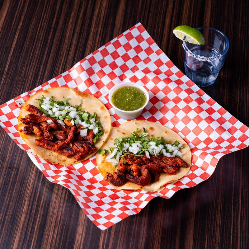 Two street-style tacos topped with fresh cilantro and chopped onions, served with a side of our homemade salsa.