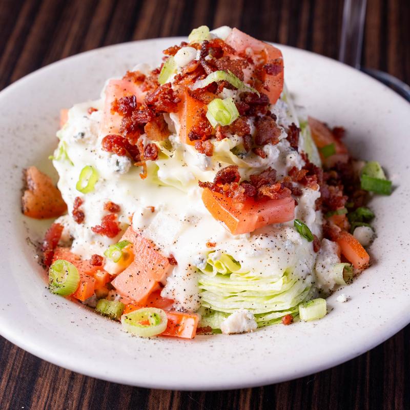 Iceberg lettuce, crispy bacon, tomato, aged blue cheese crumbles, topped with chunky blue cheese dressing.